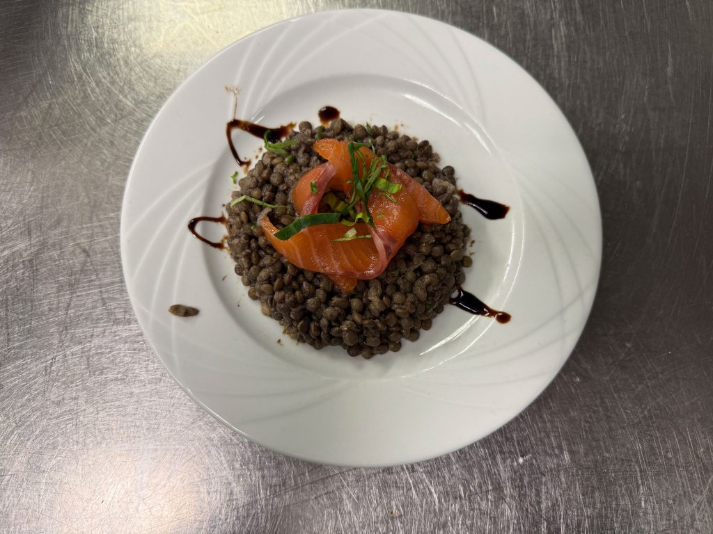 En entrée, un Gravelax de saumon mariné, sur salade de lentilles vertes du Puy, vinaigrette à la Saint-Nicolas, associé à un Saint Bris Sauvignon 2023.